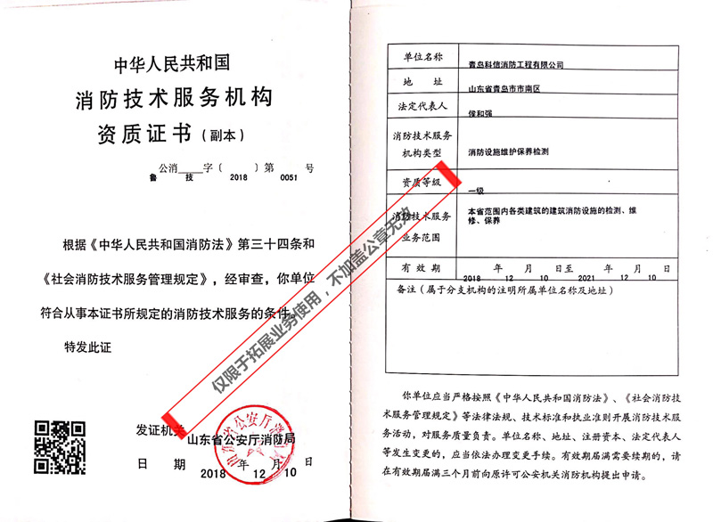 熱烈祝賀我公司-青島科信消防工程有限公司取得“消防維保檢測一級正式資質(zhì)”、“消防安全評估正式資質(zhì)”,歡迎新老客戶蒞臨指導(dǎo)!